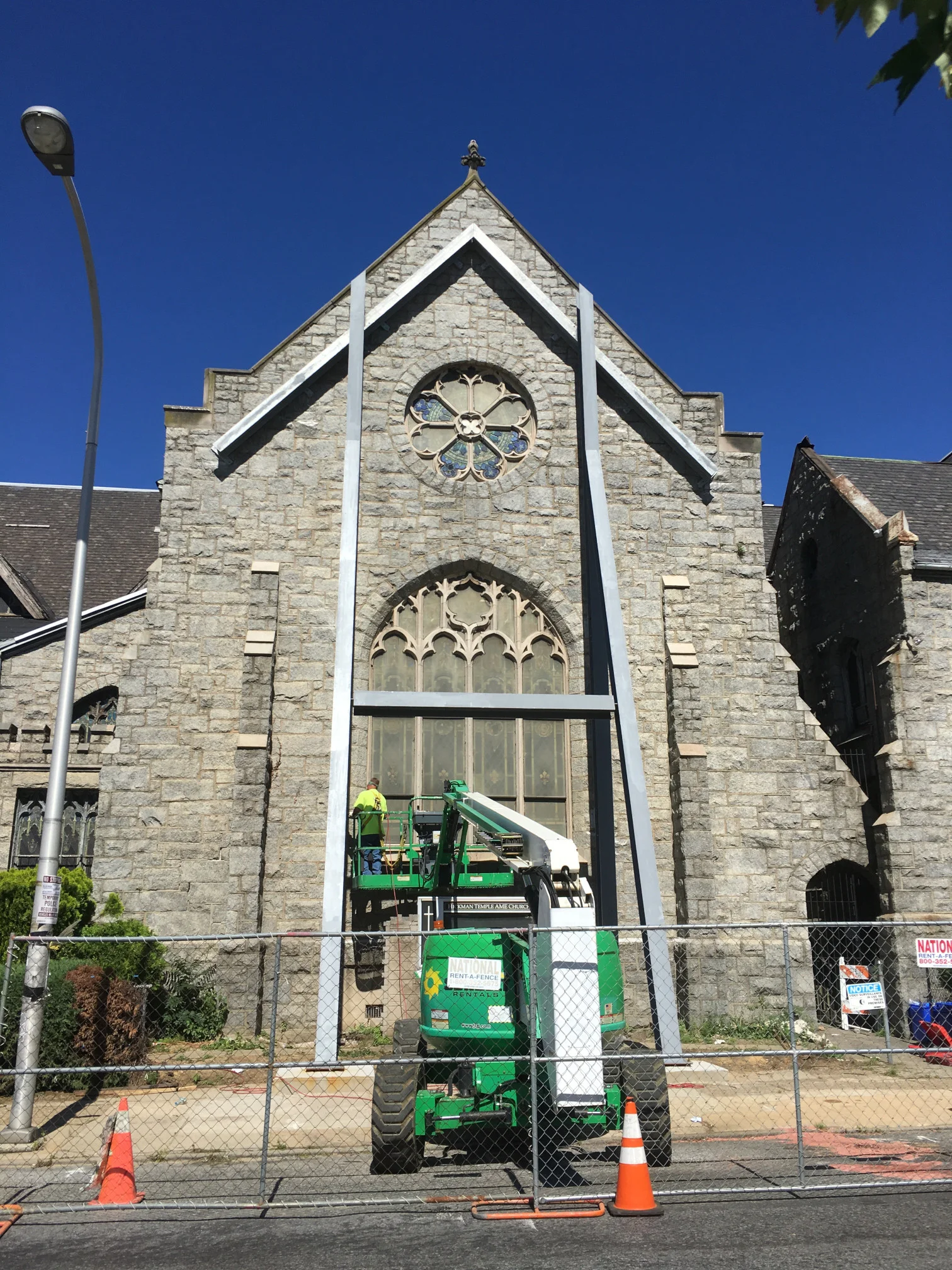 Hickman Temple is an historic church at 50th and Baltimore in West Philadelphia. In 2017, the facade on the east side of the church began to separate from the main structure, forcing the congregation to evacuate the church and worship elsewhere. Kathy Dowdell joined the church and community effort to save the building and assisted in a plan to stabilize the structure so that the congregation could return while plans are made for more permanent repairs. Steel supports were added to brace the facade, and gaps in the roof were sealed. In September 2018, services were finally able to resume in Hickman Temple.