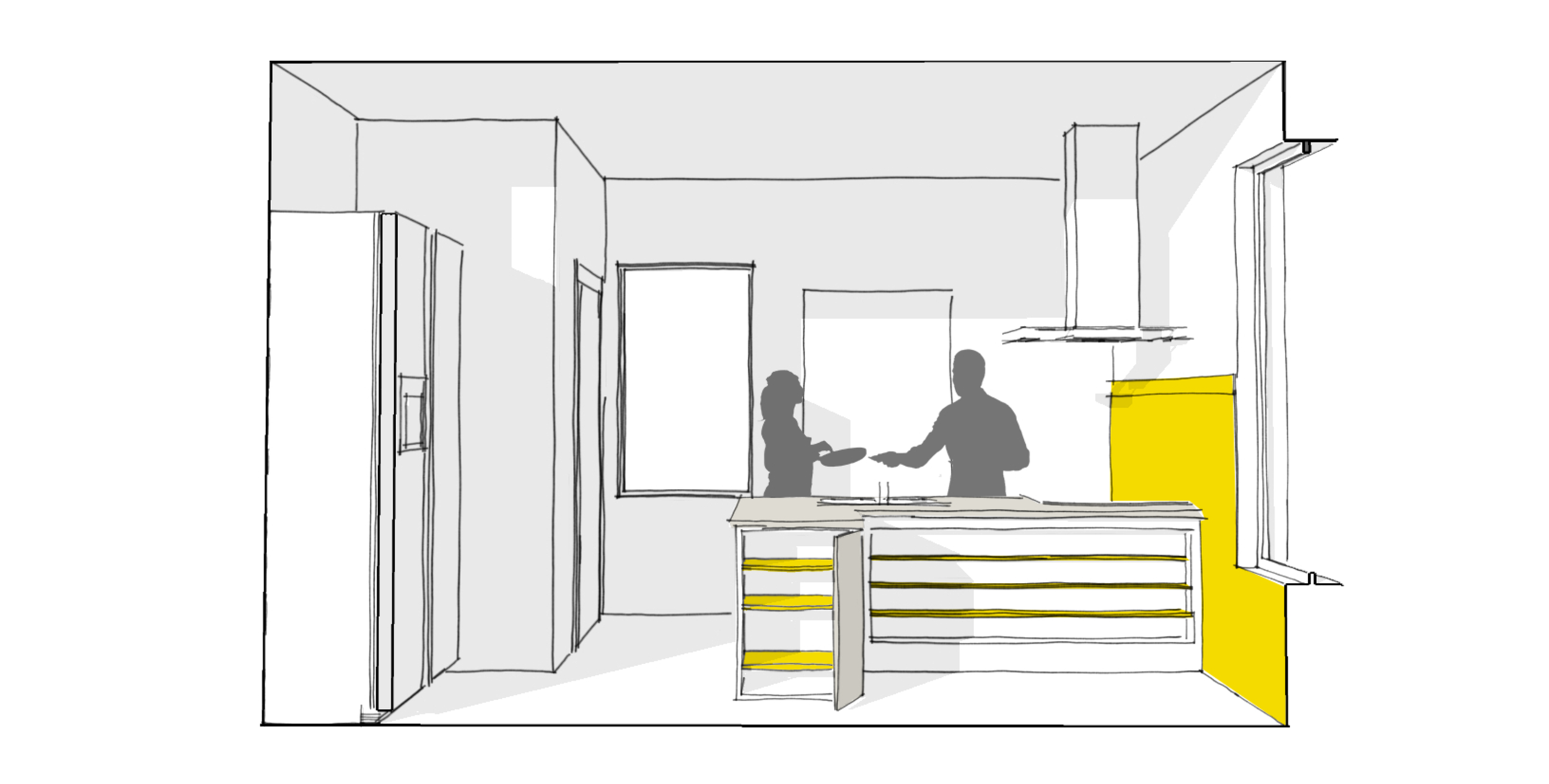 Longtime owners of this house had always wanted to open up their kitchen to the adjacent breakfast room both to get more light and to make shared cooking easier . Though tight they liked the basic arrangement and layout of appliances and fixtures and wanted to keep an original pantry cabinet, the table in front of the window and the cheerful yellow wainscoting. The dividing wall was removed, to allow the two rooms to be combined, and the rest of the design effort was primarily one of carefully measuring and planning the space down to the inches needed. New cabinets were all custom made by a local carpenter, to provide shallow storage below the counter and to maximize the available storage space.